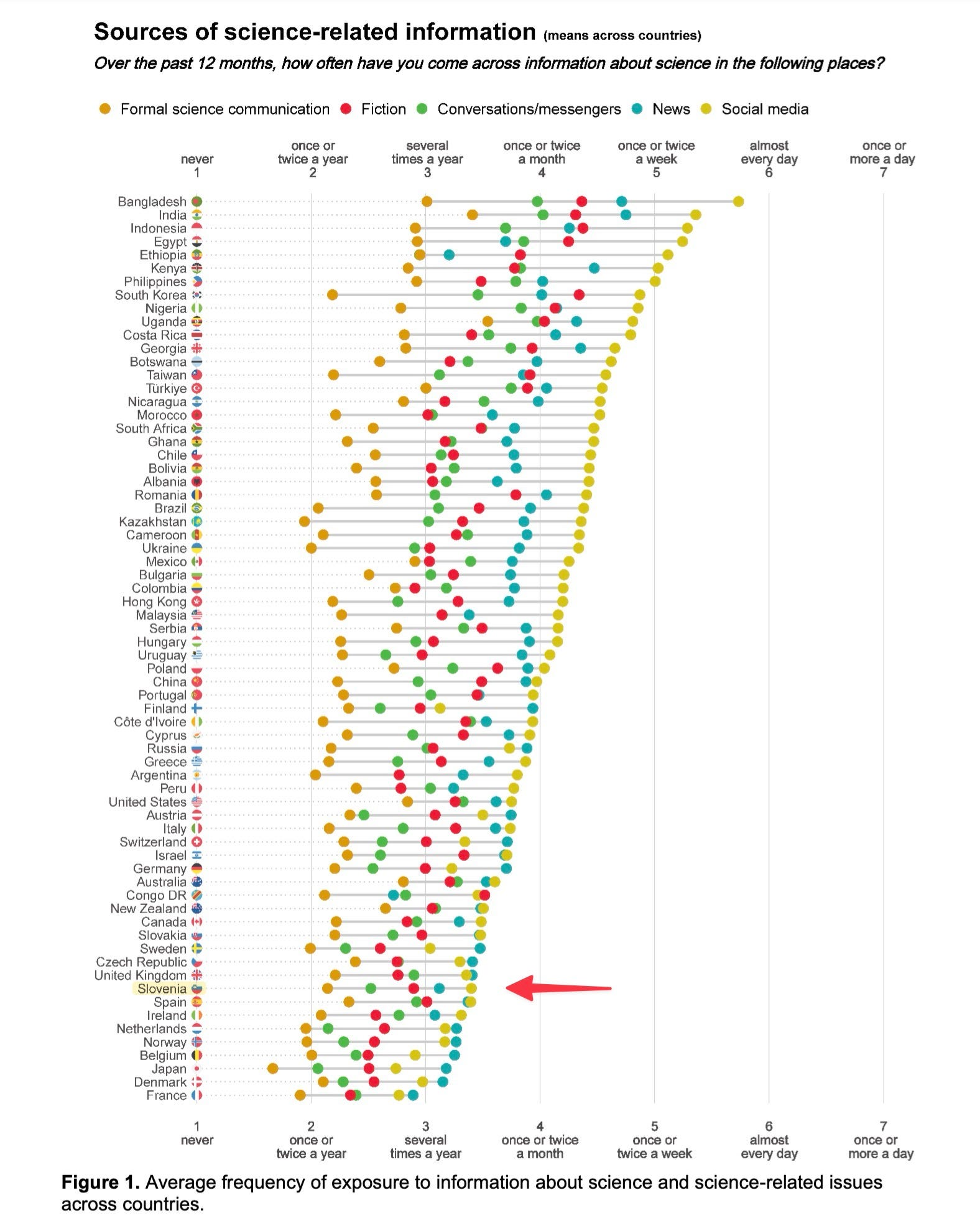 Data was collected through an extensive online survey with representative samples for each country, accounting for age and gender. Participants were asked how often and where they encountered scientific information in the past year—whether through social media, news outlets, conversations with family and friends, fiction (like movies and books), or visits to museums and other cultural institutions. Additionally, the survey explored how frequently people discussed scientific topics with others, either privately or publicly, and how often they engaged in science-related protests, such as those on climate change.
